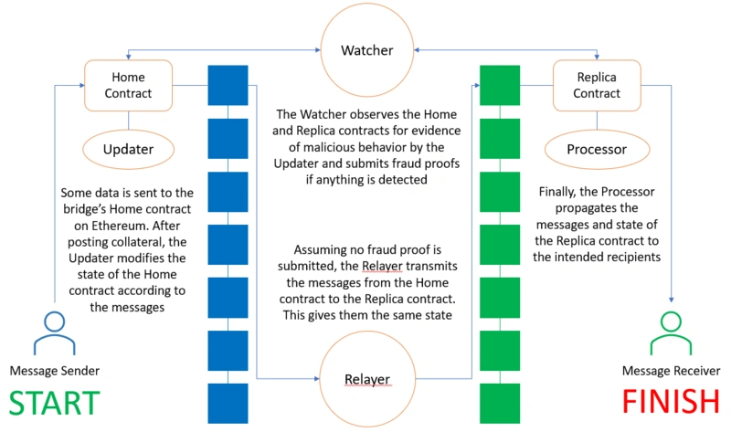 这种特殊类型的跨链桥利用位于不同链上的两个合约地址(称为主合约和副本合约)以及四个接受激励的链下不同参与者,实现跨链发送消息。该类别中最著名的协议或许是 Nomad,它使得多链应用程序实现更轻松地跨区块链生态系统进行通信。让我们通过一个从以太坊向 Polygon 发送消息的简化示例来解释它的工作原理: