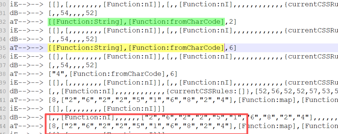54,52,50,54,53,54,58,58,50,52解码后是一个数组,我们在日志搜索数组,可以看到经过一系列运算后,变成了css中缺失的一组数组