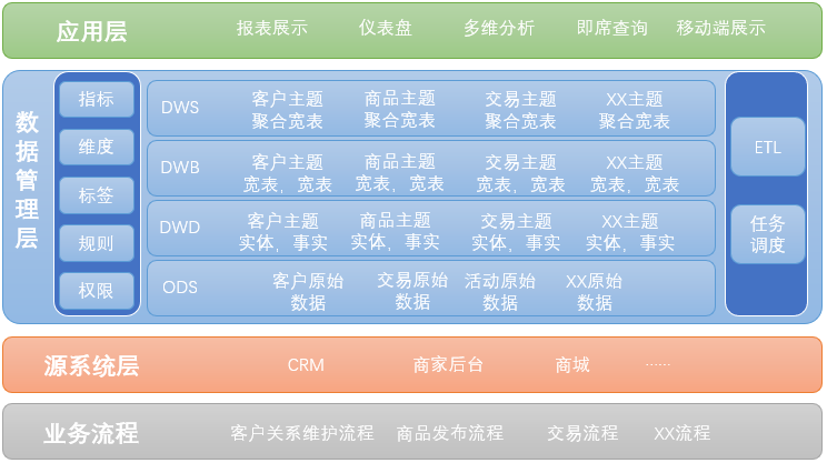 数据中台概念(一) 1.数据仓库 启蒙时代 BI诞生于上世纪90年代,数据转化为知识,帮助企业经营分析决策。 零售行业的门店管理,如果使单个门店利润最大化 分析每个商品的销售数据和库存信息 为每个商品制定合理的销售采购计划,滞销降价,畅销预测,提前采购 大数据量的范围查询 数仓之父=》比尔 恩门=》数仓是在企业管理决策中面向主题、集成、与时间相关,不可修改的数据集合 订单表和会员表