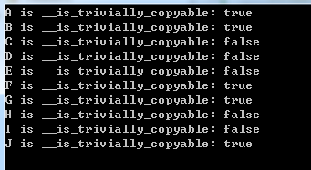 std::cout << "J is __is_trivially_copyable: " << __is_trivially_copyable(J) << std::endl;