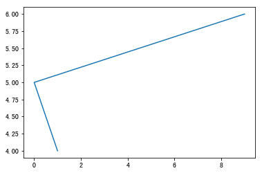 plt.plot([1, 0, 9], [4, 5, 6])