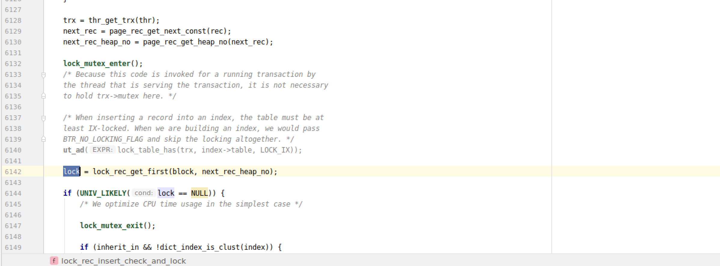 这里我们终于看到了next_rec,确实它去看了他的下一个元素是不是,找到了锁,这一步已经非常接近真相了,但是离真相还是有点远,拿到锁啥都不干?