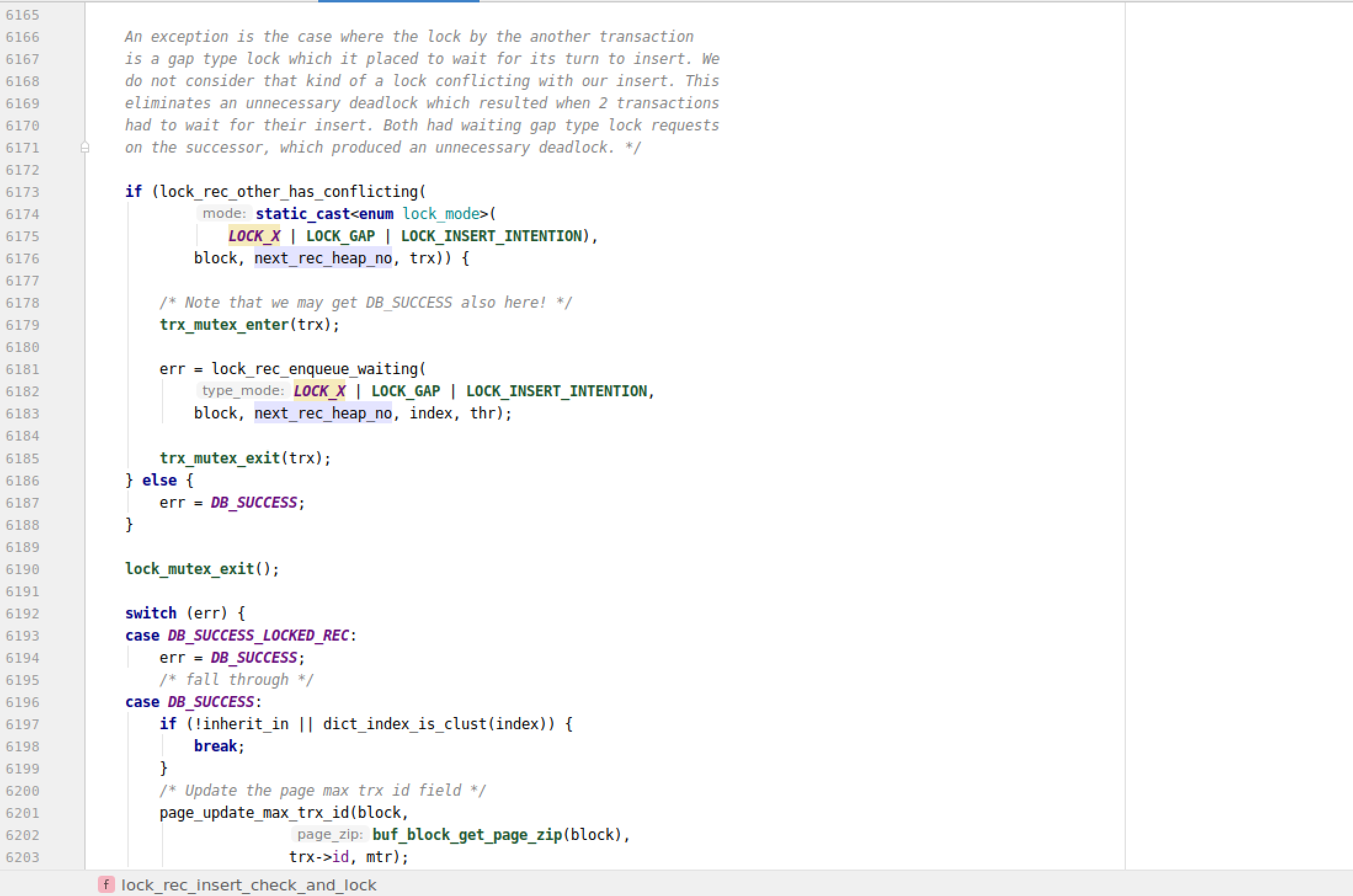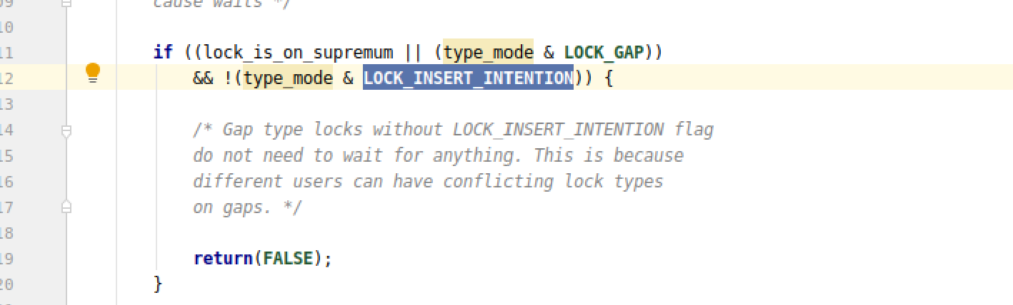 这段代码是从lock_rec_other_has_conflicting,中截出来的,也就是上面说的检查了锁的兼容性这里如果不是insert锁,会直接过锁队列,直接成功,这里就可以大致明白,innodb为了性能所作所为,和我们之前所说的为什么我查了一条不存在的数据,就简单的死锁了