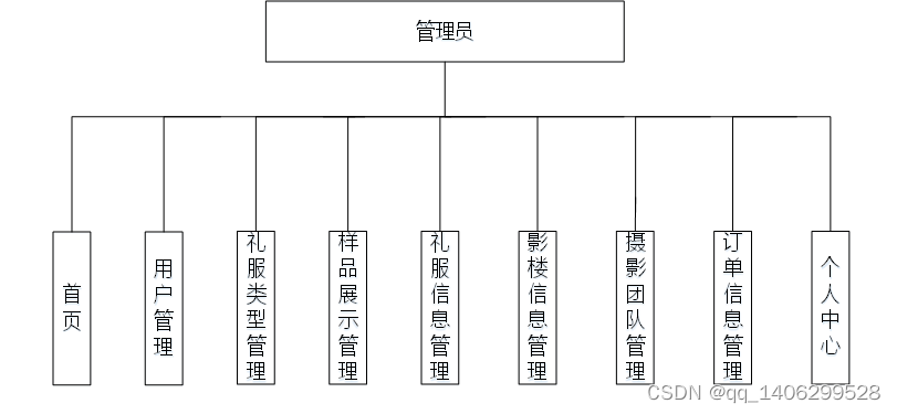 管理员所能使用的功能主要有:首页、个人中心、用户管理、礼服信息管理、礼服类型信息管理、影楼信息管理、样品展示管理、摄影团队管理、订单信息管理等。