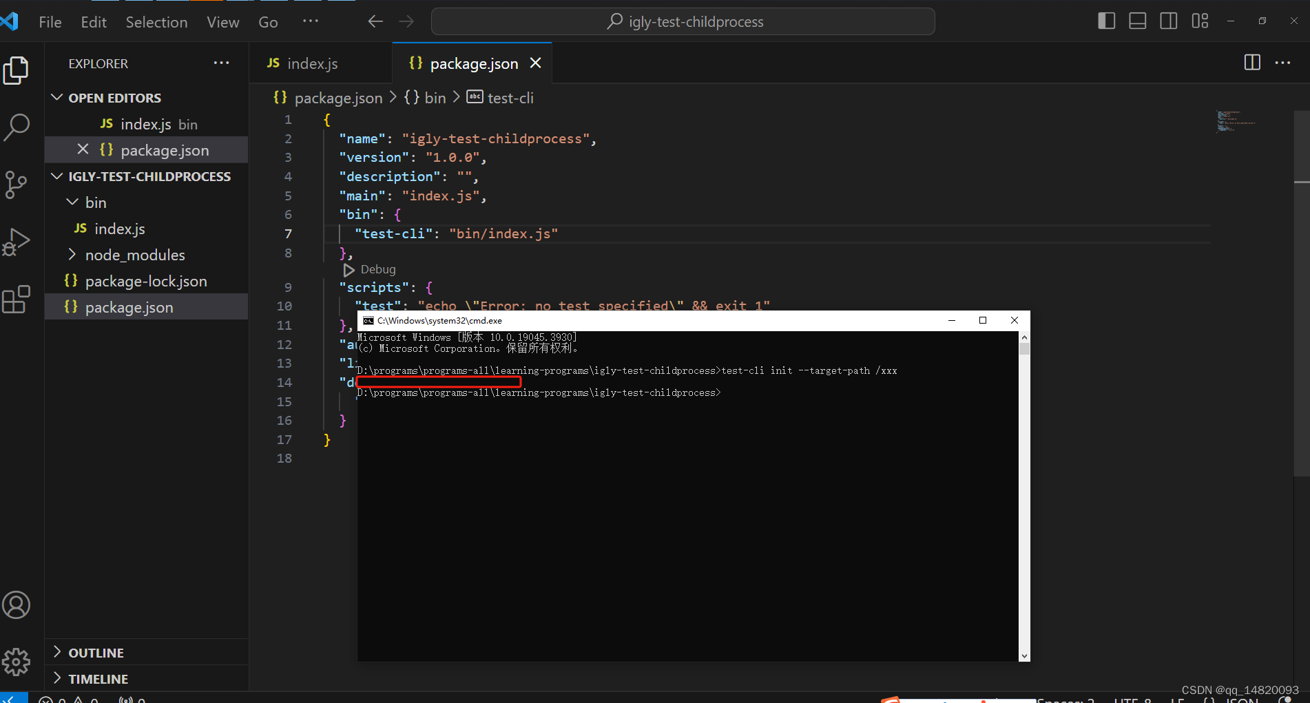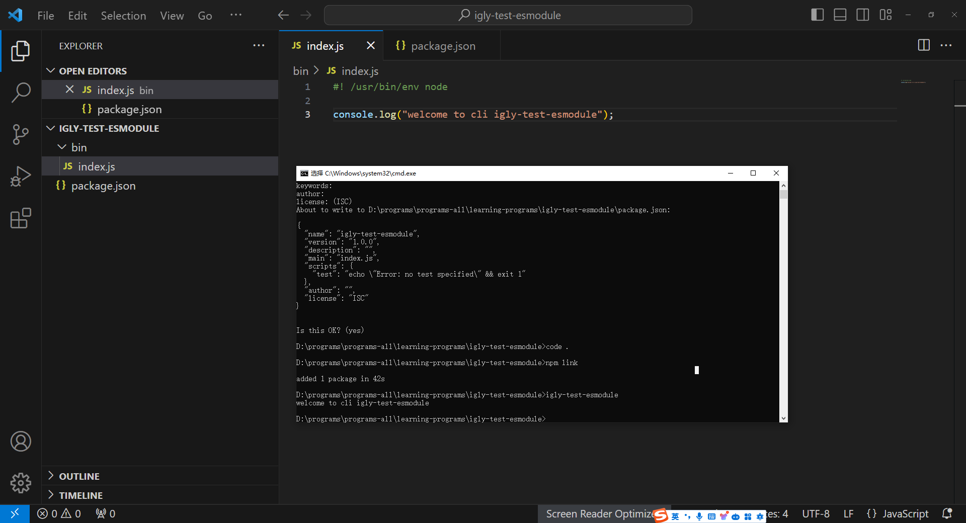 在node项目中支持ES Module 5、在package.json文件中添加一个bin的入口配置。1、创建一个项目目录 igly-test-esmodule。2、初始化igly-test-esmodule 项目。4、在bin 目录下创建一个 index.js 文件。第一种支持 ES Module 的 方式到此结束。6、在index.js 打印一句话测试。3、创建一个bin目录。