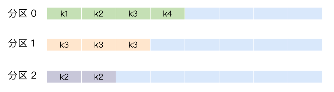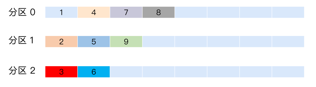 所谓随机就是我们随意地将消息放置到任意一个分区上。如图所示,9 条消息随机分配到不同分区。