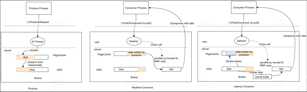 pwrite()系统调用写入数据,此时数据都会先写入page cache。Consumer 消费消息时,Broker 使用