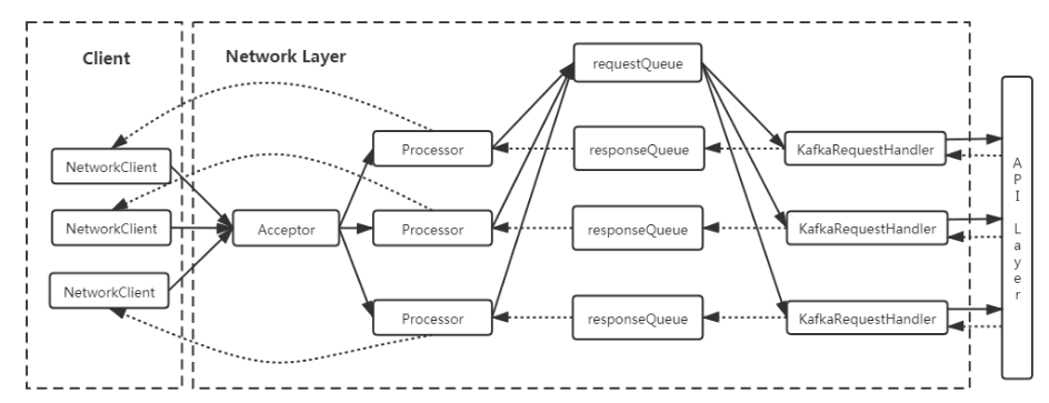 KafkaRequestHandler:请求处理线程,从 RequestChannel 中读取请求,调用 KafkaApis 进行业务逻辑处理,并将响应放回 RequestChannel 的响应队列。KafkaRequestHandler 线程池中的线程数量由配置参数