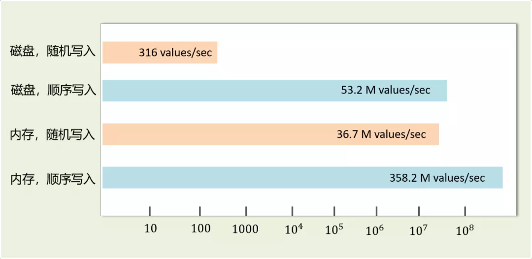 如下图所示,可以看到磁盘顺序写的性能远高于磁盘随机写,甚至比内存随机写还快。