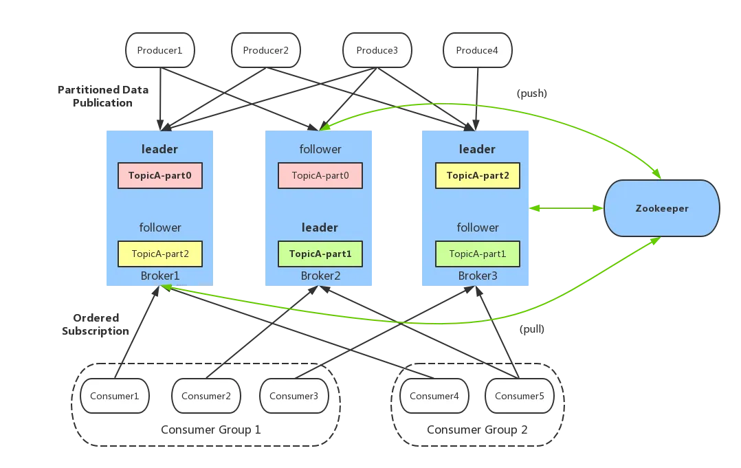 Topic(主题)与 Partition(分区) :Kafka 中的消息以 Topic 为单位进行划分,生产者将消息发送到特定的 Topic,而消费者负责订阅 Topic 的消息并进行消费。图中 TopicA 有三个 Partiton(TopicA-par0、TopicA-par1、TopicA-par2)