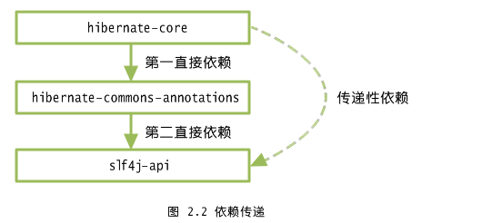 如上图所示,hibernate-core 依赖 hibernate-commons-annotations ,而 hibernate-commons-annotations 又依赖 slf4j-api ,hibernate-core 对 slf4j-api 的依赖就是传递依赖。我们只需要引入 hibernate-core 构件的依赖,不用考虑它还有其它的依赖, 也不用担心会引入多余或冲突的依赖,Maven 会自动为我们引入依赖及传递依赖。