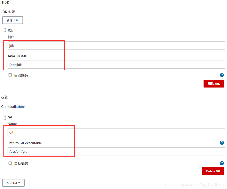 系统管理 -> 全局工具设置(Global Tool Configuration),配置jdk.git,maven的根目录