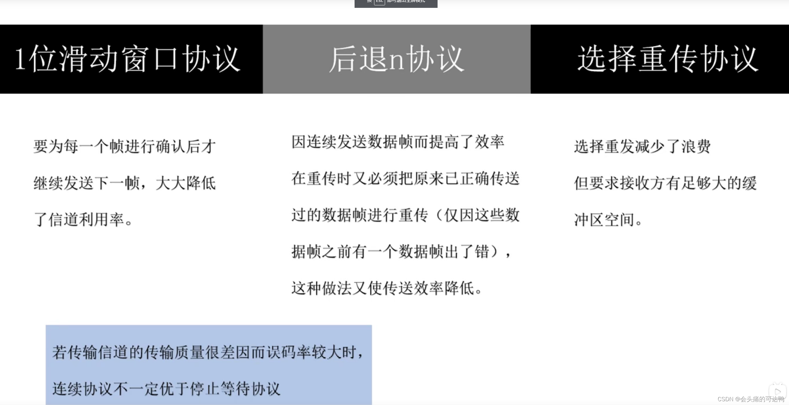 原理:接收端总会缓存所有收到的帧,当某个帧出现错误时,只会要求重传这一个帧,只有当某个序号后的所有帧都正确收到后,才会一起提交给高层应用。重传协议的缺点在于接受端需要更多的缓存。