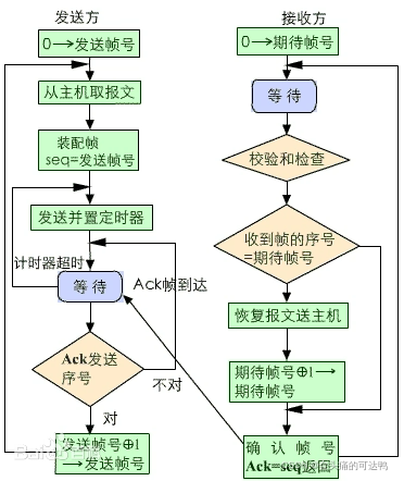 发送窗口=接收窗口= 1,1个比特就够表示了,所以也叫1比特滑动窗口协议, 发送单帧后必须等待确认,未确认前不能再发送其他数据帧
