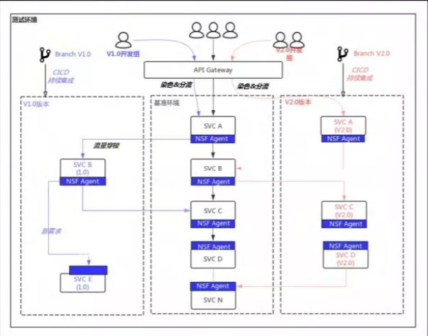 当客户端进行测试的时候,通过流量染色标记不同的测试分支流量,将该流量路由至测试版本。当这五个服务之内相互调用的时候,微服务框架就会选择这五个服务的实例进行调用,如果需要调用五个服务之外的其他服务的时候,微服务框架会到Master环境里面,选择服务实例进行调用。有了流量染色的环境治理机制,测试环境数量会大大减少。