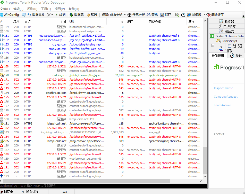 抓包工具端: fiddler(点击右下角)—>出现捕获中。