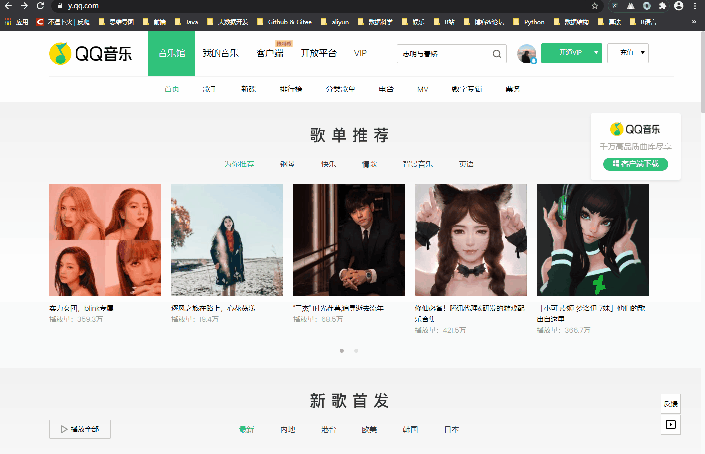 下面下给出QQ音乐的Web端的网址:https://y.qq.com/