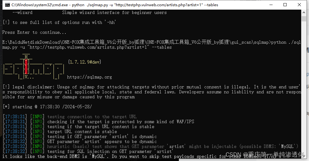 046 sqlmap-post 所以我们的注入语句应该是:python ./sqlmap.py "http://testphp.vulnweb.com/userinfo.php" --data "uname=test&pass=test" --tables。抓取登录数据包表单数据:uname=test&pass=test。