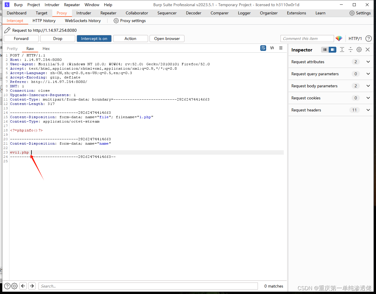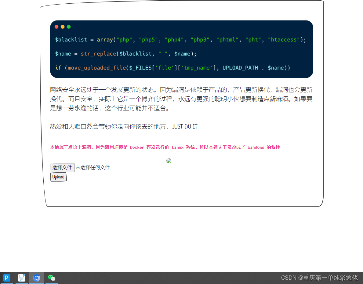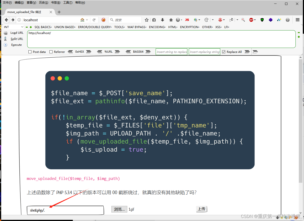 047 PHP上传 6-10题 黑名单&%00截断&黑名单缺陷&逻辑缺陷 PHP 内核是由 C 语言实现的,所以使用了 C 语言中的一些字符串处理函数。所以在这个地方,攻击者只要在最后加入一个 0 字节,就能截断 file 变量之后的字符串 PHP小于5.3版本可以输入a.php%00进行截断。然后不停的访问上传shell.php和不停的访问upload/shell.php就能生成xiao.php。禁止后缀为php的文件上传,由于系统特性区分大小写 于是可以1.PHp上传。写一个shell.php访问就生成一个xiao.php的后门文件。因为在下面 所以要对%00进行解码。