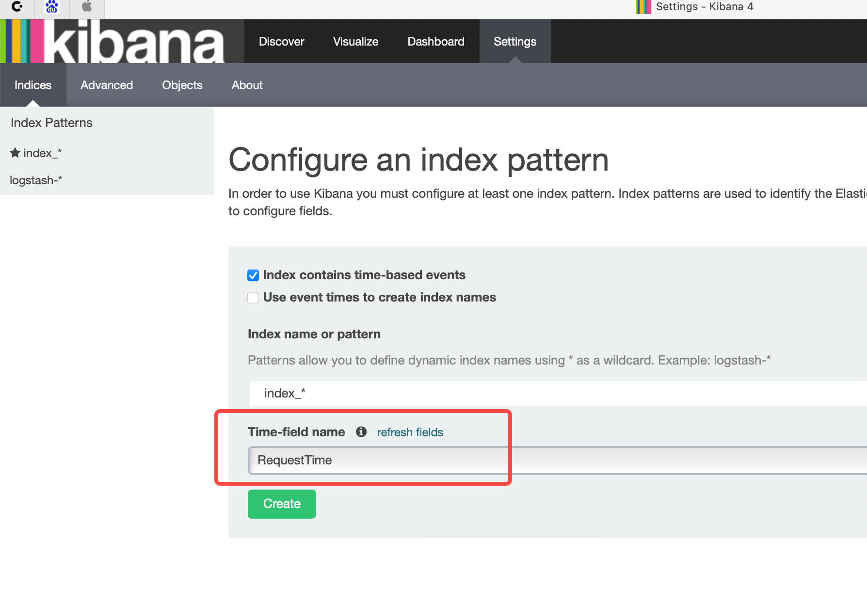 kibana初始化问题,Time-filed Name位置 kibana初始化时,Time-filed Name位置下拉没有内容网上找了很多的解决办法,给到的解决办法很简单,使用curl命令请求一下即可,但是复制的内容总是报各种错误,某些格式错误之类的,但是也看不出啥问题,要么就是空格,或者斜杠有问题:curl -XPUT "http://localhost:9200/index_2021.11.21 -d '{"mappings":{"trans":{"properties":{"RequestTime":{"type":"date","format":"Y