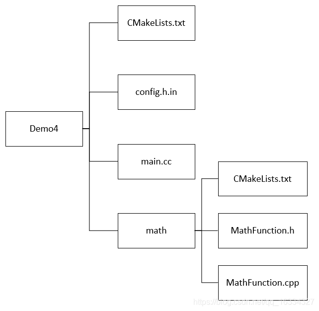 Demo4的文件结构如上所示,可以将 MathFunctions 库设为一个可选的库,如果该选项为 ON ,就使用该库定义的数学函数来进行运算,否则就调用标准库中的数学函数库