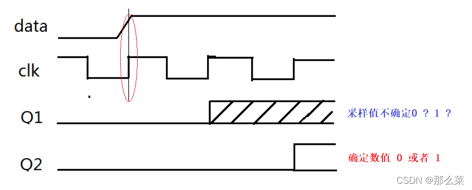 data是时钟域1的数据,需要传到时钟域2(clk)进行处理,寄存器1和寄存器2使用的时钟都为clk。假设在clk的上升沿正好采到data的跳变沿(从0变1的上升沿,实际上的数据跳变不可能是瞬时的,所以有短暂的跳变时间),那这时作为寄存器1的输入到底应该是0还是1呢?这是一个不确定的问题。所以Q1的值也不能确定,但至少可以保证,在clk的下一个上升沿,Q1基本可以满足第二级寄存器的保持时间和建立时间要求,出现亚稳态的概率得到了很大的改善。