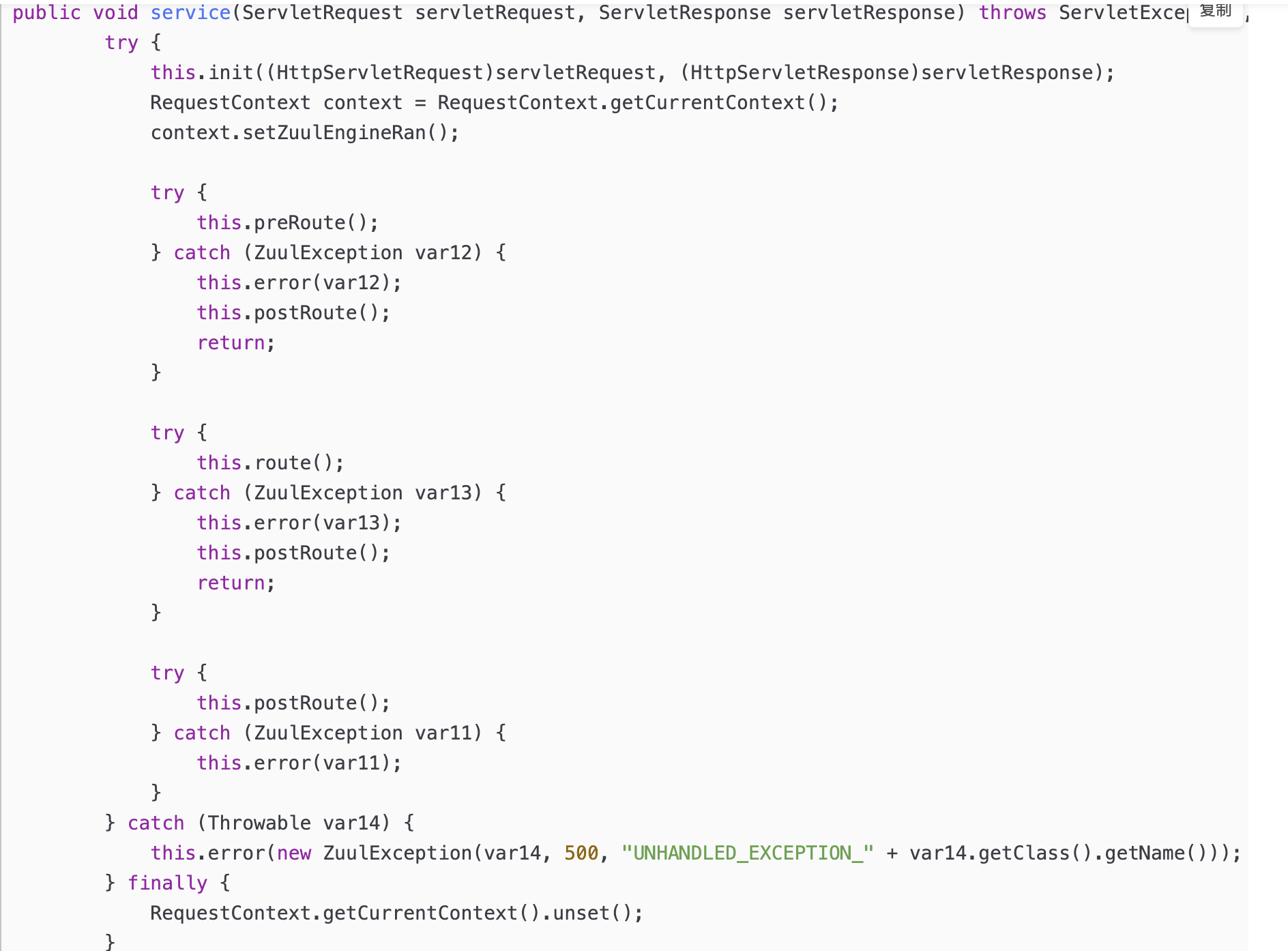 三个核心的方法preRoute(),route(), postRoute(),zuul对request处理逻辑都在这三个方法里