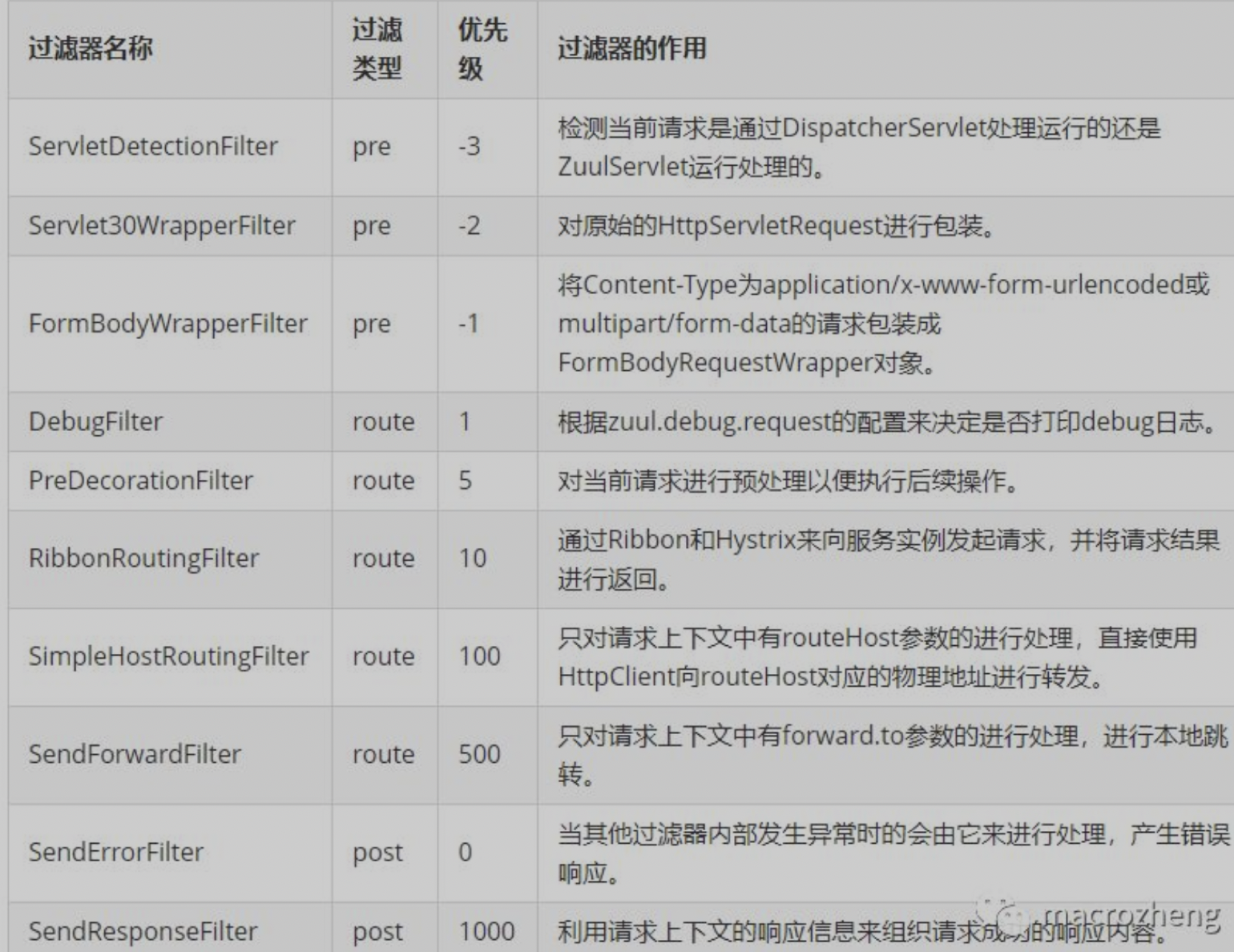 Zuul大部分功能都是通过过滤器来实现的。Zuul中定义了四种标准过滤器类型,这些过滤器类型对应于请求的典型生命周期。