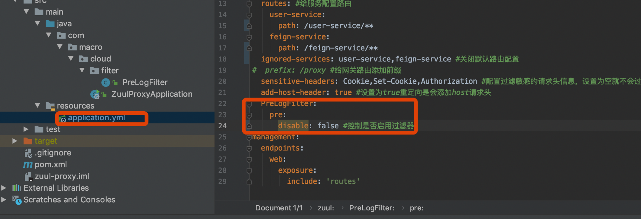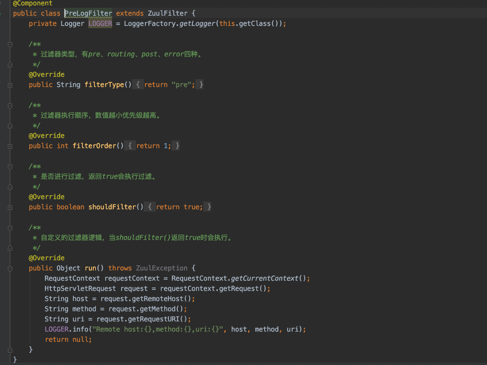 这是一个前置过滤器,用于在请求路由到目标服务前打印请求日志。