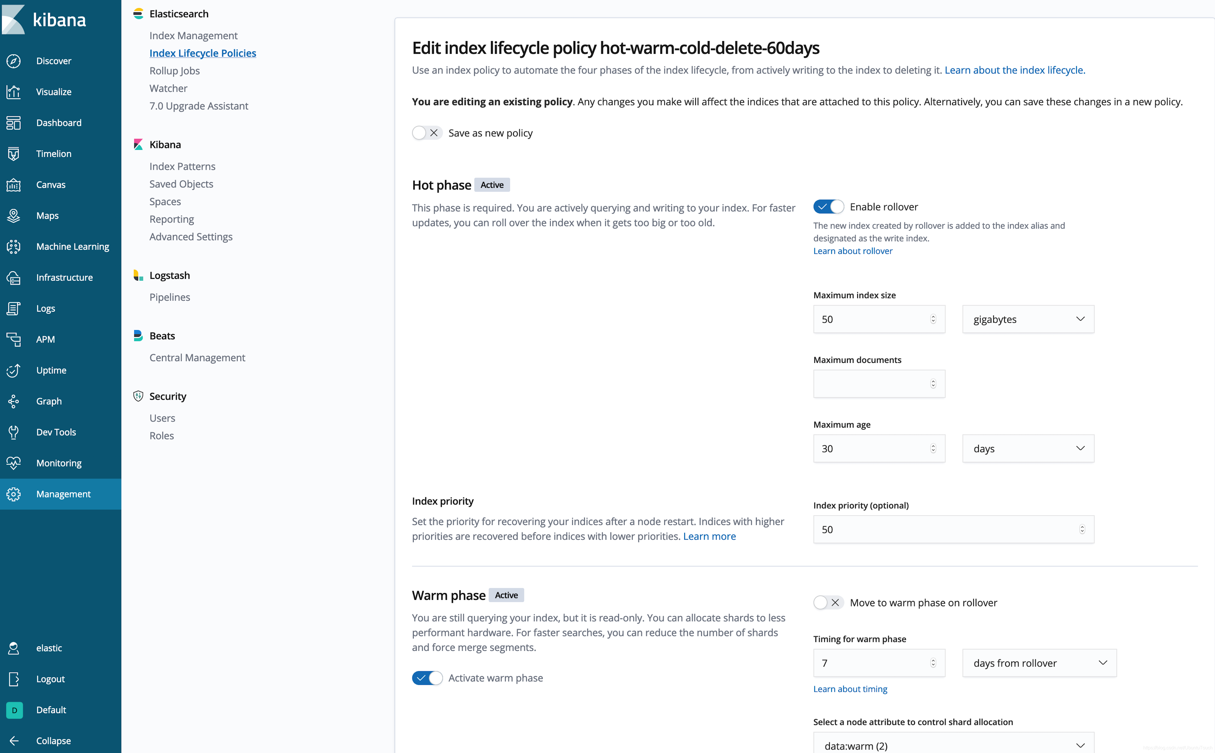 这个 ILM 策略首先会将索引优先级设置为一个较高的值,以便热索引在其他索引之前恢复。30 天后或达到 50GB 时(符合任何一个即可),该索引将滚动更新,系统将创建一个新索引。该新索引将重新启动策略,而当前的索引(刚刚滚动更新的索引)将在滚动更新后等待 7 天再进入温阶段。
