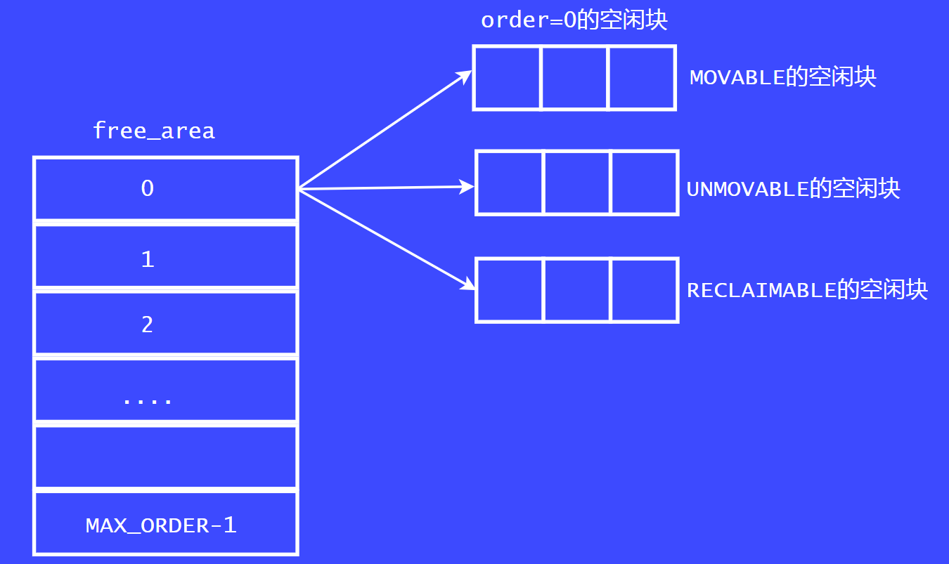 我们看这张图,现在的页面分配器中,每个free_area数组成员中都增加了一个迁移类型。也就是说在每个order链表中多增加了一个链表。例如,order = 0 的链表中,新增了MOVABLE 链表,UNMOVABLE 链表,RECLAIMABLE链表。随着内核的发展,迁移类型越来越多,但常用的就那三个。