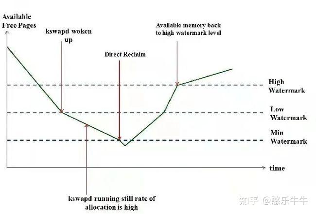 对于kswapd来说,要回收多少内存才算完成任务呢?只要把空余内存的大小恢复到”high”对应的watermark值就可以了,当然,这取决于当前空余内存和”high”值之间的差距,差距越大,需要回收的内存也就越多。”low”可以被认为是一个警戒水位线,而”high”则是一个安全的水位线。