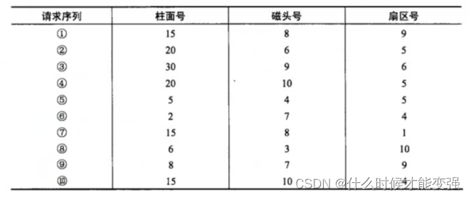 (2)CSCAN调度算法又称为循环算法,最小磁道号紧接着最大磁道号构成循环,进行扫描。题目中从第一个请求开始,即15->20->30->2->5->6->8,再按照扇区号从小到大排序,即⑦⑩①②④③⑥⑤⑧⑨