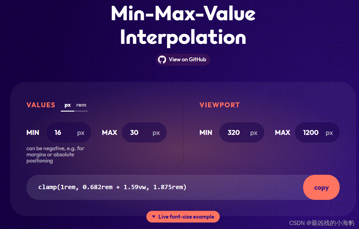 CSS实现文字大小自适应 函数的作用是把一个值限制在一个上限和下限区间,当这个值超过区间范围时,在最小值和最大值之间选择一个值使用。它接收三个参数:最小值、首选值、最大值。假设浏览器窗口最小300px,最大1200px,当窗口小于300px的时候字体大小为。在写页面的时候,兼容手机和PC页面,这样字体大小就需要根据页面的大小进行动态变化。,当窗口大于1200px的时候,字体大小为。,否则就使用区间的首选值(