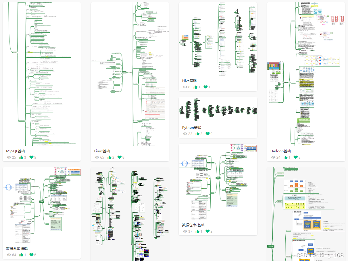 - 其中涵盖了:数据仓库、Hadoop、Mysql、Hive、Spark、Flink、HBase、Linux 等广受欢迎的大数据思维导图。