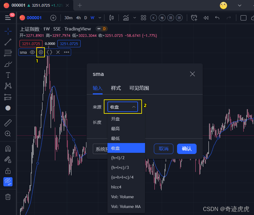 即每根K柱的价格,这个“价格”有不同的形式,比如:open 开盘价 “o”;close 收盘价 “c”;high 最高价 “h”;low 最低价 “l”;hl2 即 (h+l)/2;hlc3 即 (h+l+c)/3;ohlc4 即 (o+h+l+c)/4。