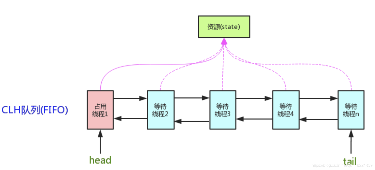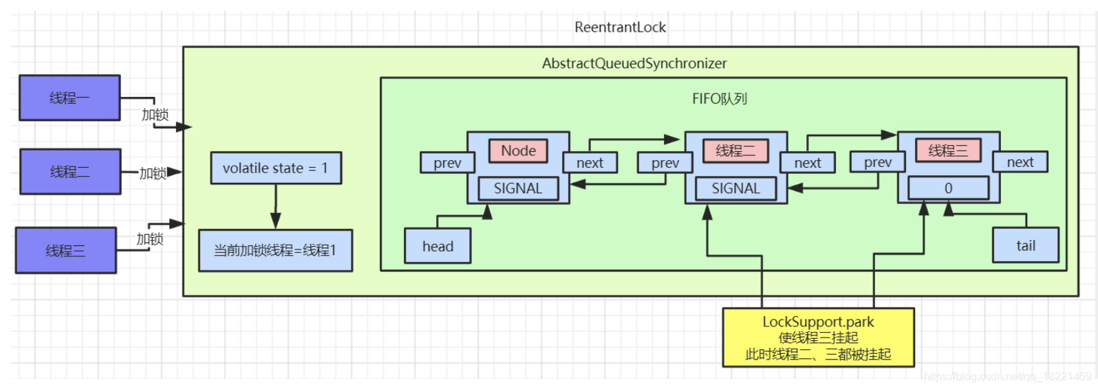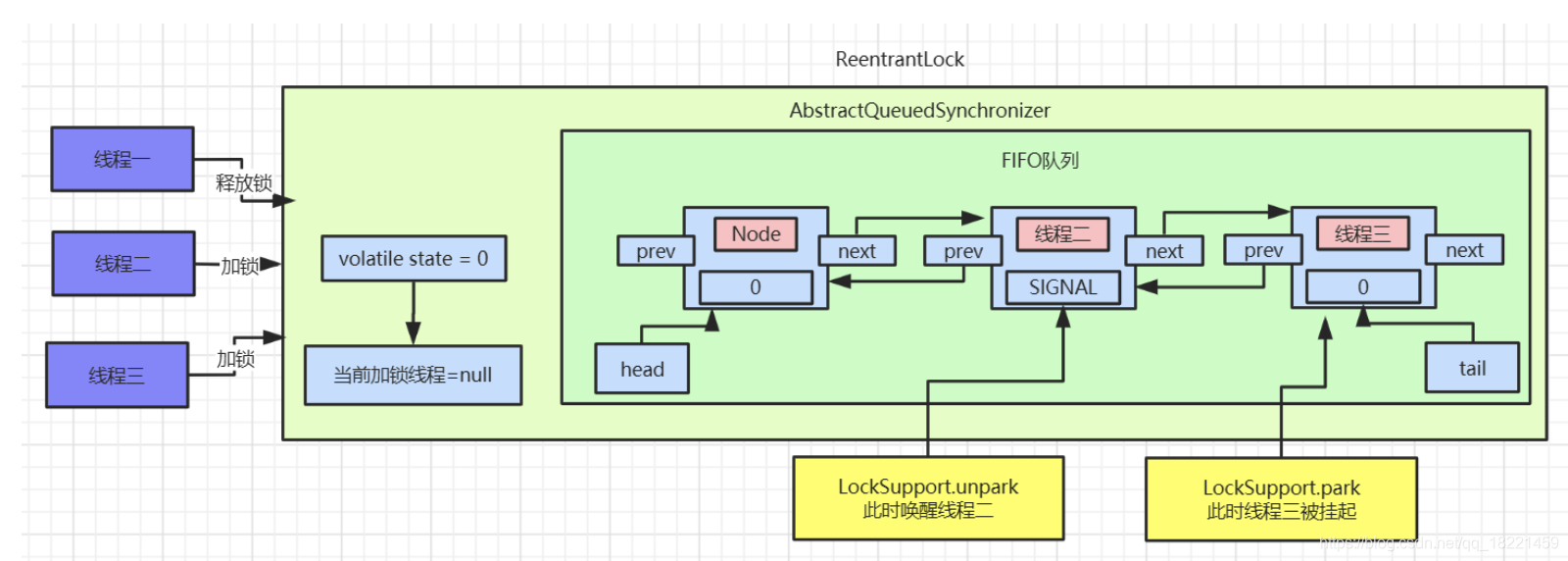 AQS中维护了一个volatile int state(代表共享资源)和一个FIFO线程等待队列(多线程争用资源被阻塞时会进入此队列)。这里volatile能够保证多线程下的可见性,当state=1则代表当前对象锁已经被占有,其他线程来加锁时则会失败,加锁失败的线程会被放入一个FIFO的等待队列中,比列会被UNSAFE.park()操作挂起,等地其他获取锁的线程释放锁才能被唤醒。