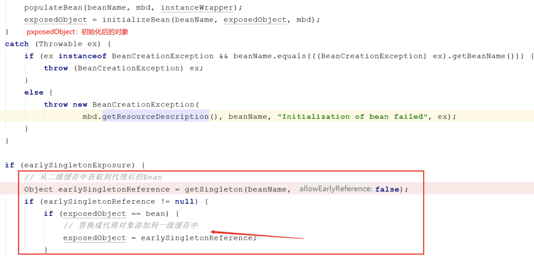 以单例创建A为例,假设AB之间现在没有依赖关系,但是A被代理了,这个时候当A完成实例化后还是会进入下面这段代码: