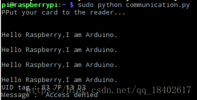 实际上博主是在做mfrc522,所以效果图略有不同,只要显示Hello Raspberry,I am Arduino.就说明可以了。