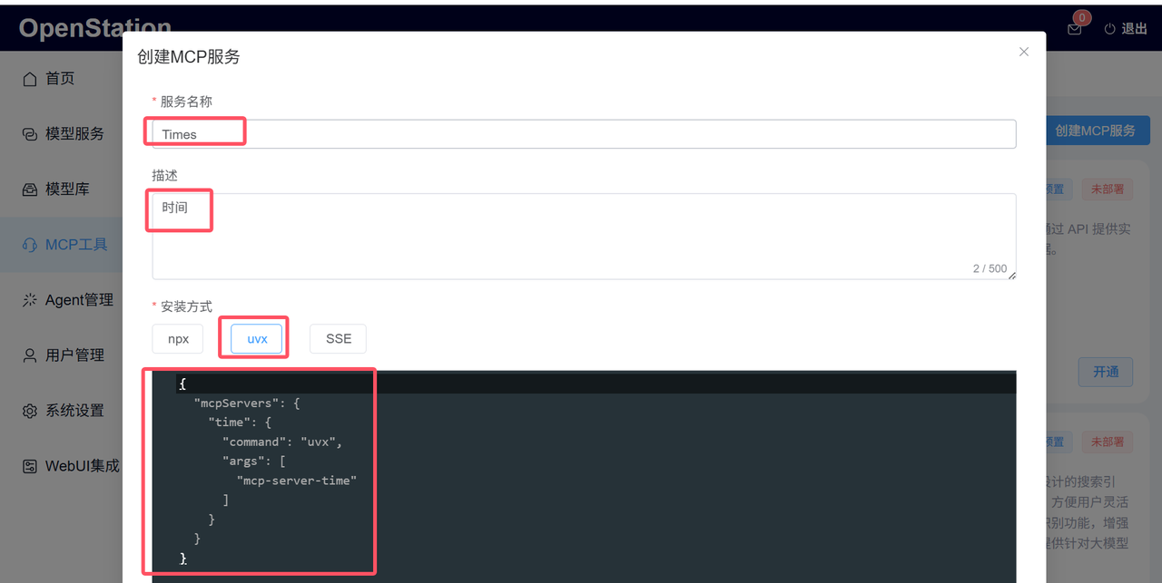 例如,若需创建获取本地时间的工具,可通过 “创建MCP服务” 自定义工具: