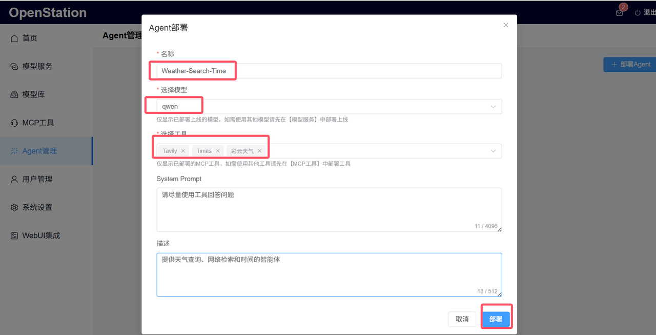 创建 Agent 需依赖两个前置条件:① 至少 1 个已部署的模型服务;② 至少 1 个已部署的Mcp工具。本次以创建能够提供天气查询、网络检索和显示时间的智能体服务为例,具体步骤如下: