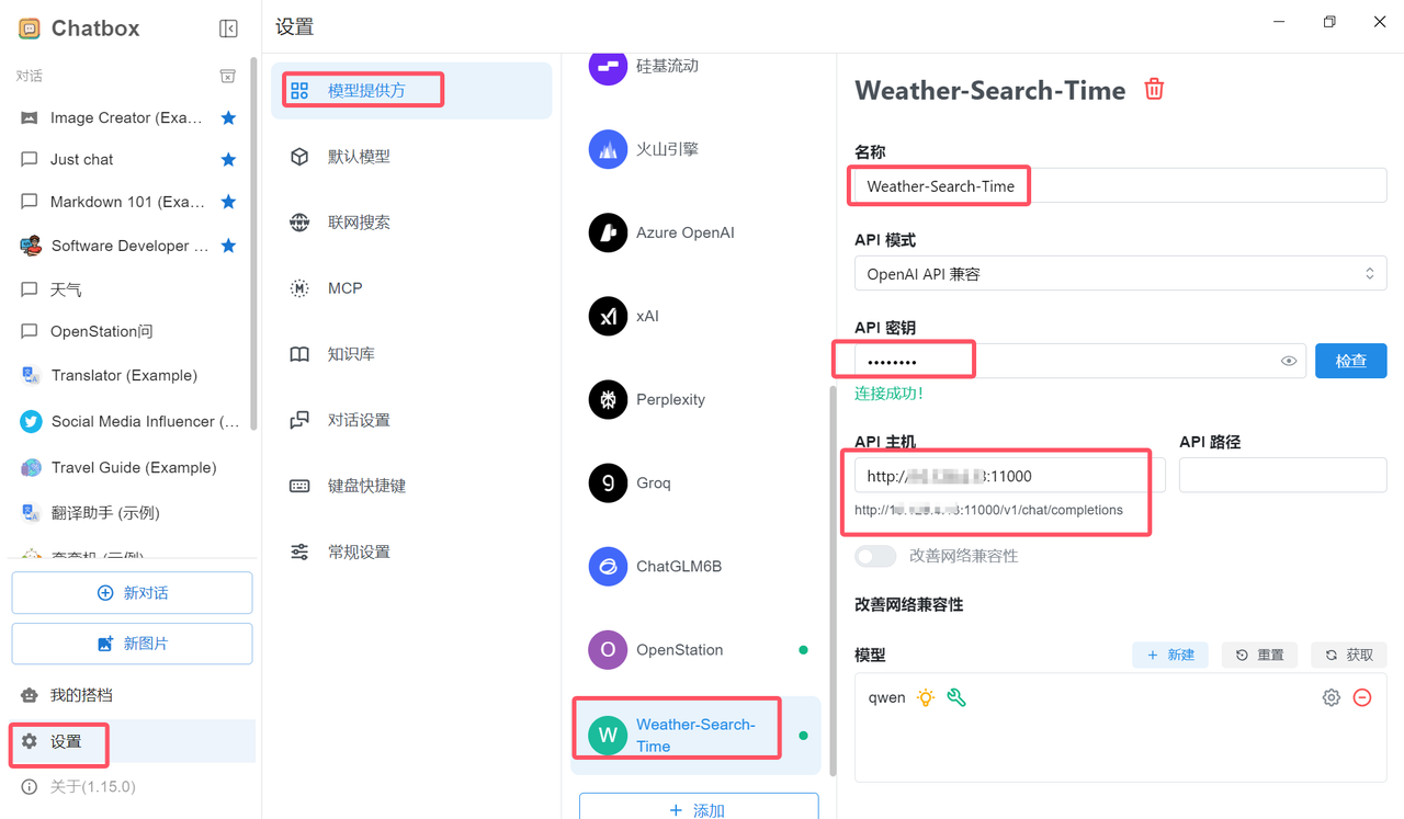 服务地址:从部署的Agent详情页获取(如http://部署节点IP地址:11000),兼容 OpenAI API 格式,可直接接入 ChatBox 等客户端,如下图所示;