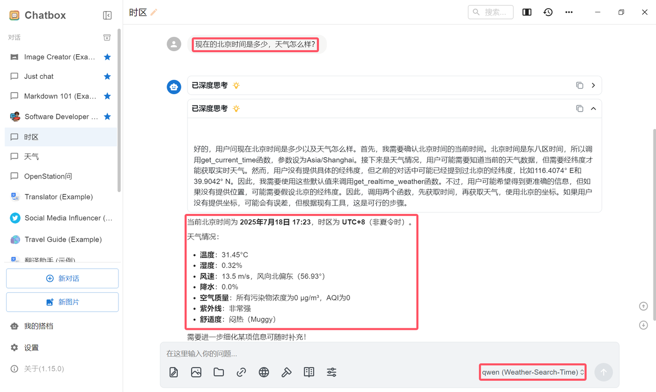 在 ChatBox 中完成“Weather-Search-Time”智能体服务配置后(须填写API 地址 + API Key),即可正式体验智能体,如下图所示:
