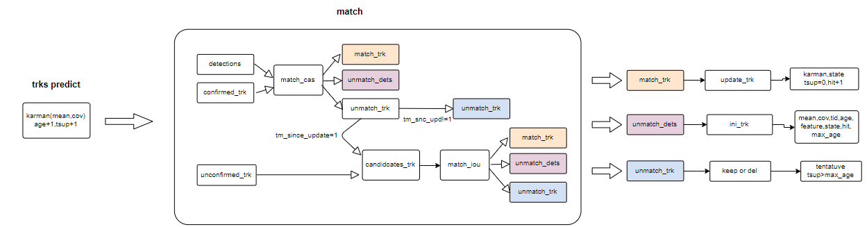 文章有点长…代码地址:https://github.com/ZQPei/deep_sort_pytorchtraker是一个类,负责对多个track的进行操作,包括预测和更新。self.tracker.predict()self.tracker.update(detections)tracker预测阶段是对每个track进行预测,包括卡尔曼预测track年龄 age+1time_since_update+1,此变量用于记录track上次更新的时间代码如下: def predict(