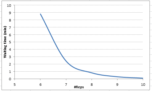 等待时间的负值意味着参数的值不可行,并且我们有一个不稳定的系统。很明显,9 Reps,我们的平均等待时间降至0.3分钟。