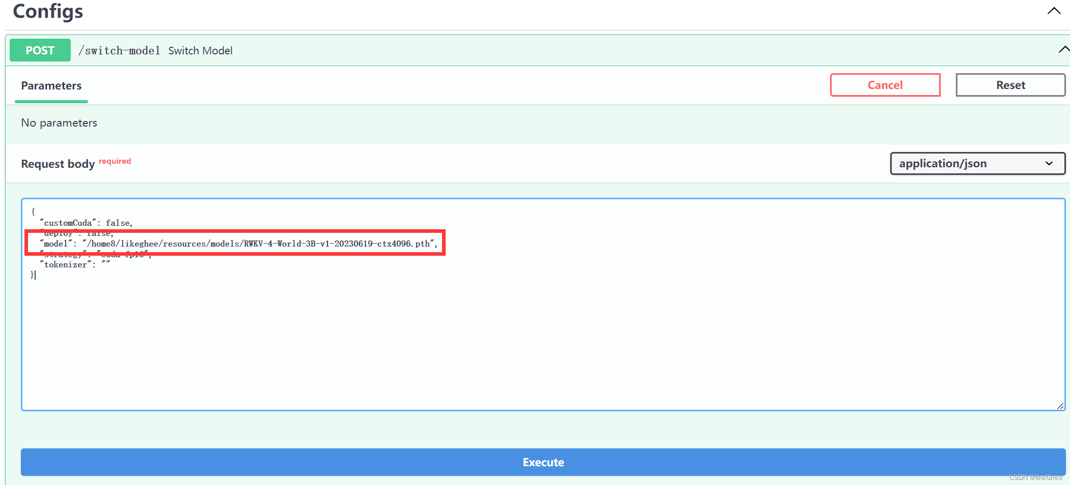 点try it out修改request body,将路径改成自己的路径,execute即可