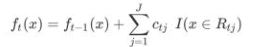 本轮的决策树拟合强学习器函数如下(其中I为使c最优的叶子节点集合,求和部分只有一个叶子节点被命中,即残差):