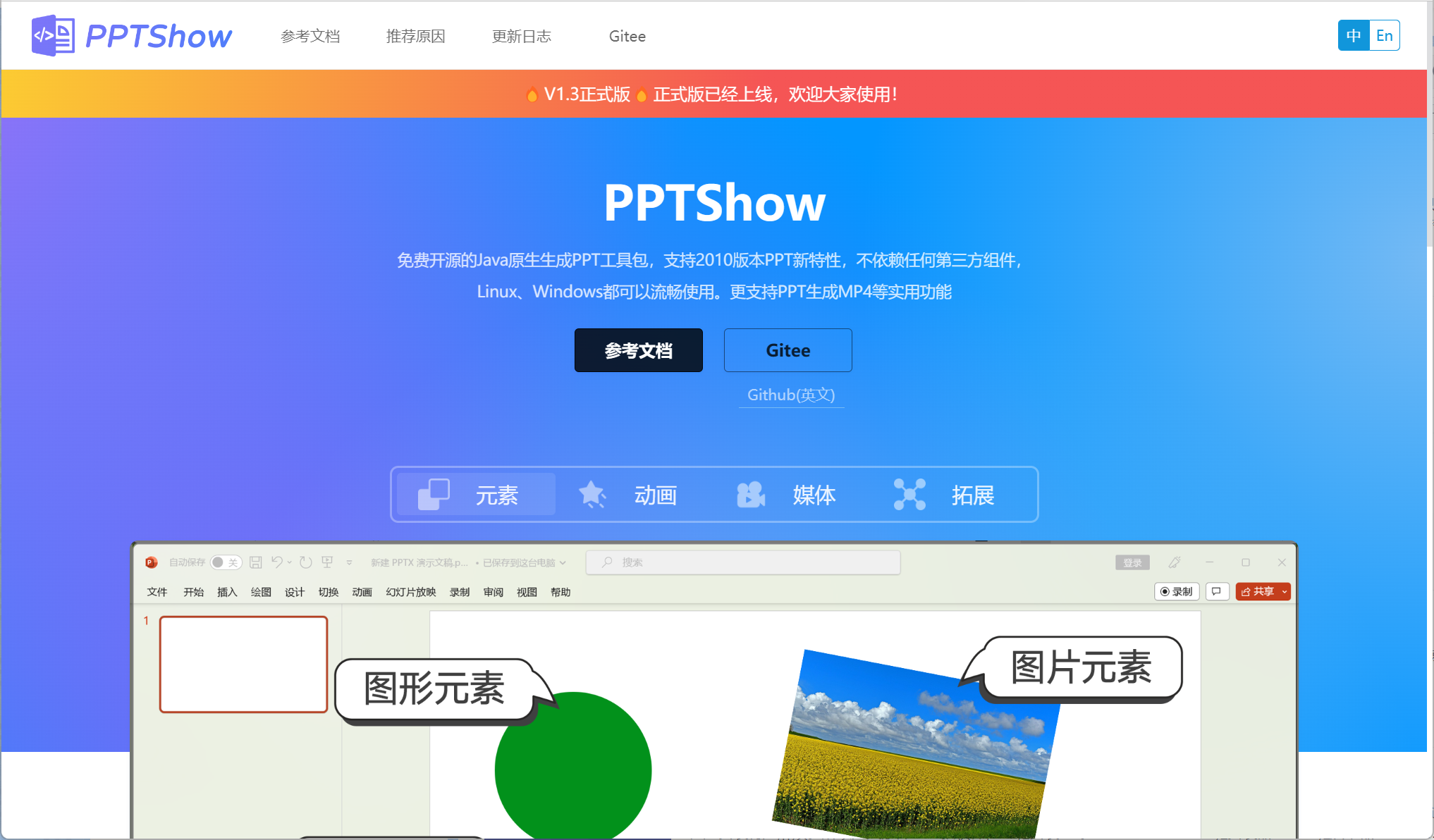 跨平台的开源Java生成PPT文件工具包,PPTShowV1.3更新啦 PPTShow是一个开源的Java生成PPT文档工具包,支持2010版PPTX新特性。它几乎屏蔽了底层XML操作,用户只需要极其简单的创建元素对象就可以生成PPT;完美支持了中文环境的字体等操作,针对中文做了特殊适配并且还支持PPT生成图片、PPT生成视频等操作。
