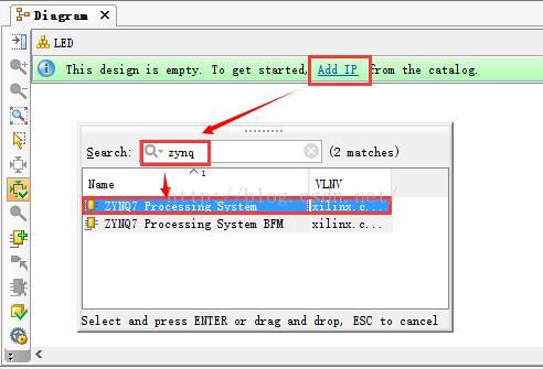 然后,点击Add IP,输入zynq,选择第一个,然后双击添加Process Sytem的IP。如图5所示: