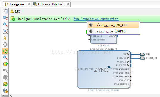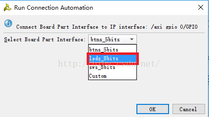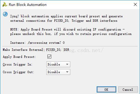 弹出对话框,同样直接点“OK”。接着,类似地,依次点击“Run Connection Automation”->"/axi_gpio_0"/GPIO,